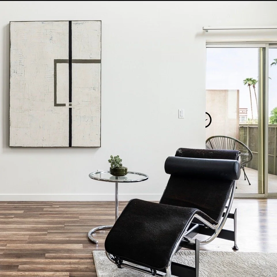 At Tokoph Design, we strive to create unique, beautifully staged homes by collaborating with exceptional artists like Loren Yagoda, a talented Master Painter for Restoration Hardware. At her Art + Co. gallery, Stacey and I selected artwork for our latest staging at The Vale, a modern condo designed by architect Will Bruder. We chose pieces to enhance each room of the property’s dramatic, architectural beauty. For The Vale’s living room, with its soaring ceilings and unique windows, we needed art that was bold yet complementary. We chose two striking black-and-white pieces from Loren’s architectonic series, echoing Bruder’s aesthetic, and a green-gray painting with linear brushstrokes reminiscent of the condo’s exterior agave and stone landscaping.